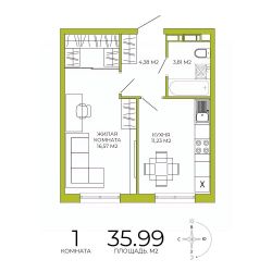 Продаётся 1-комнатная квартира в строящемся доме (дом 3), срок сдачи: IV-кв. 2026, общей площадью 35.99 кв.м., на 12 этаже. Дизайнерская отделка.