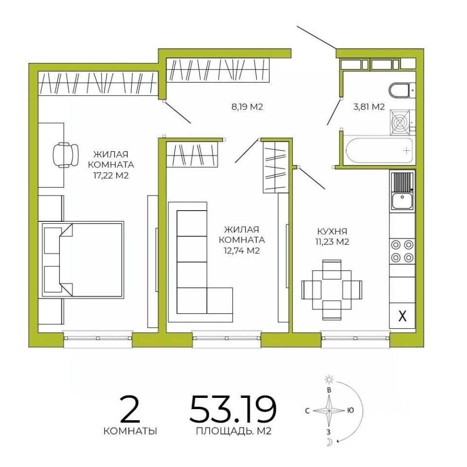 Продаётся 2-комнатная квартира в строящемся доме (дом 3), срок сдачи: IV-кв. 2026, общей площадью 53.19 кв.м., на 15 этаже. Дизайнерская отделка.