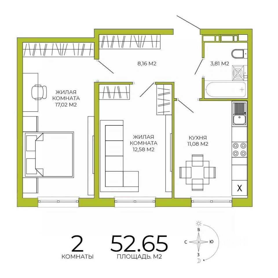 Продаётся 2-комнатная квартира в строящемся доме (дом 3), срок сдачи: IV-кв. 2026, общей площадью 52.65 кв.м., на 2 этаже. Дизайнерская отделка.
