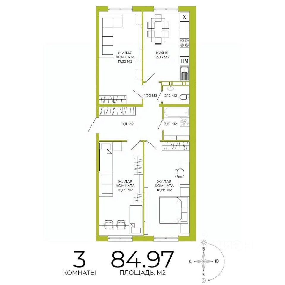 Продаётся 3-комнатная квартира в строящемся доме (дом 3), срок сдачи: IV-кв. 2026, общей площадью 84.97 кв.м., на 11 этаже. Дизайнерская отделка.