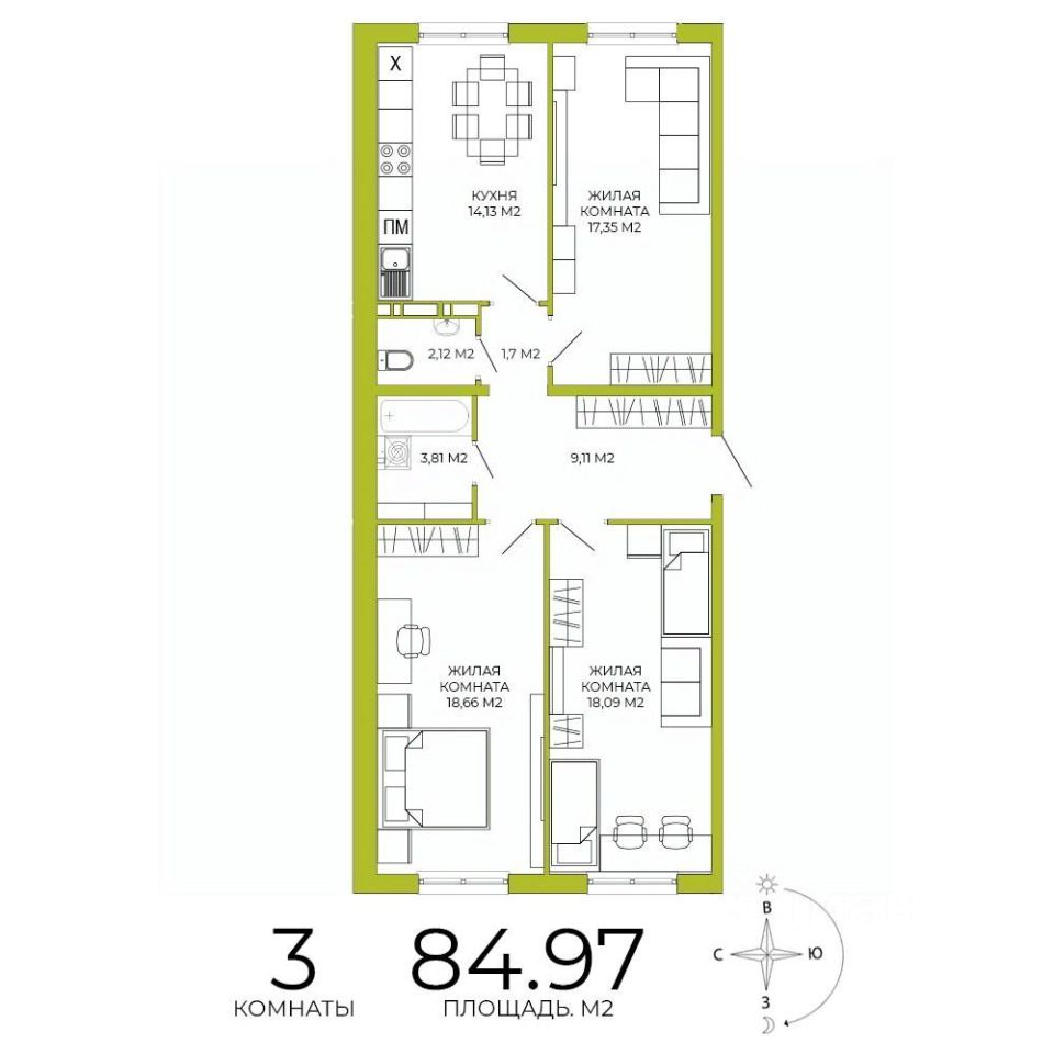 Продаётся 3-комнатная квартира в строящемся доме (дом 3), срок сдачи: IV-кв. 2026, общей площадью 84.97 кв.м., на 14 этаже. Дизайнерская отделка.