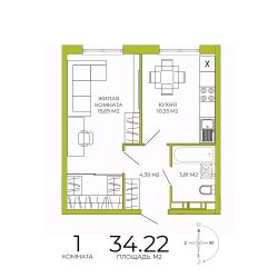 Продаётся 1-комнатная квартира в строящемся доме (дом 3), срок сдачи: IV-кв. 2026, общей площадью 34.22 кв.м., на 7 этаже. Дизайнерская отделка.