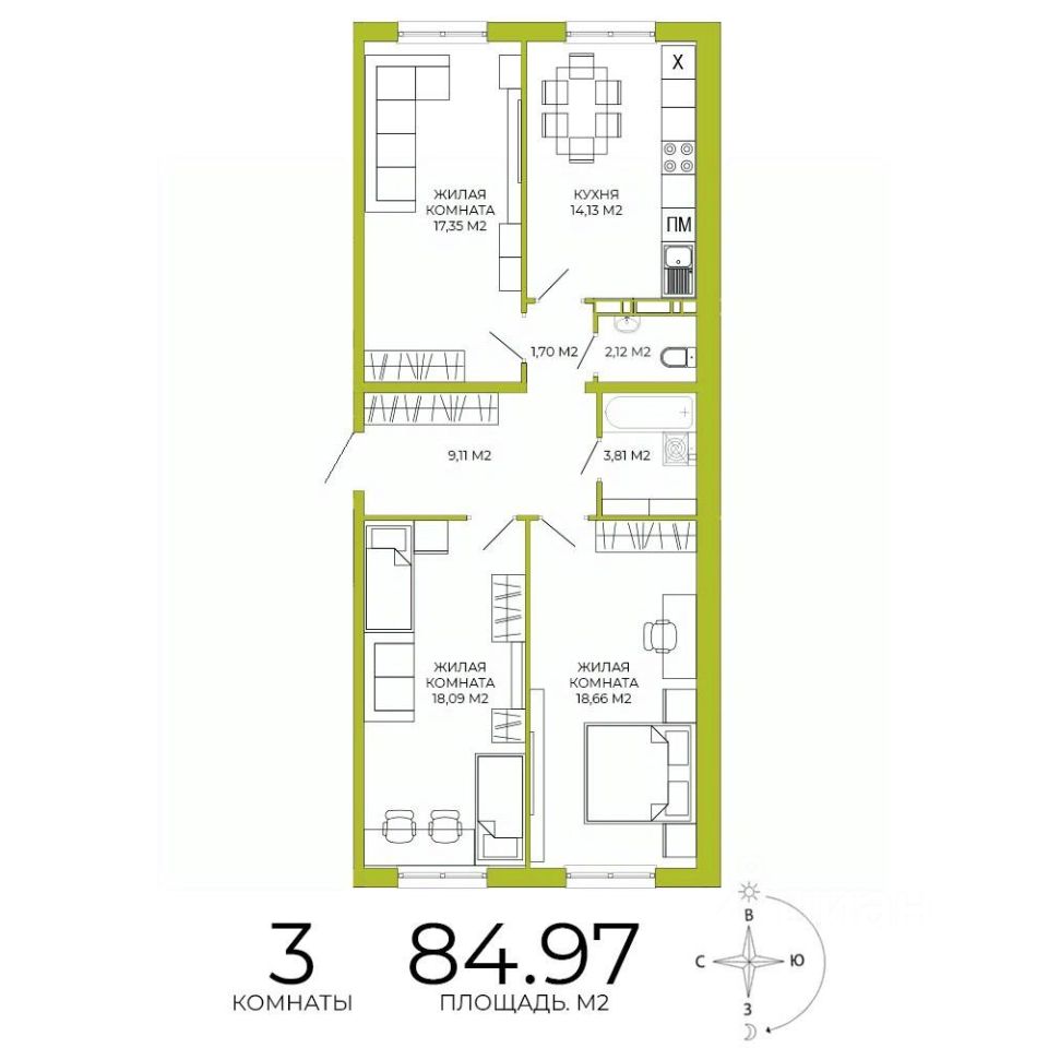 Продаётся 3-комнатная квартира в строящемся доме (дом 3), срок сдачи: IV-кв. 2026, общей площадью 84.97 кв.м., на 9 этаже. Дизайнерская отделка.
