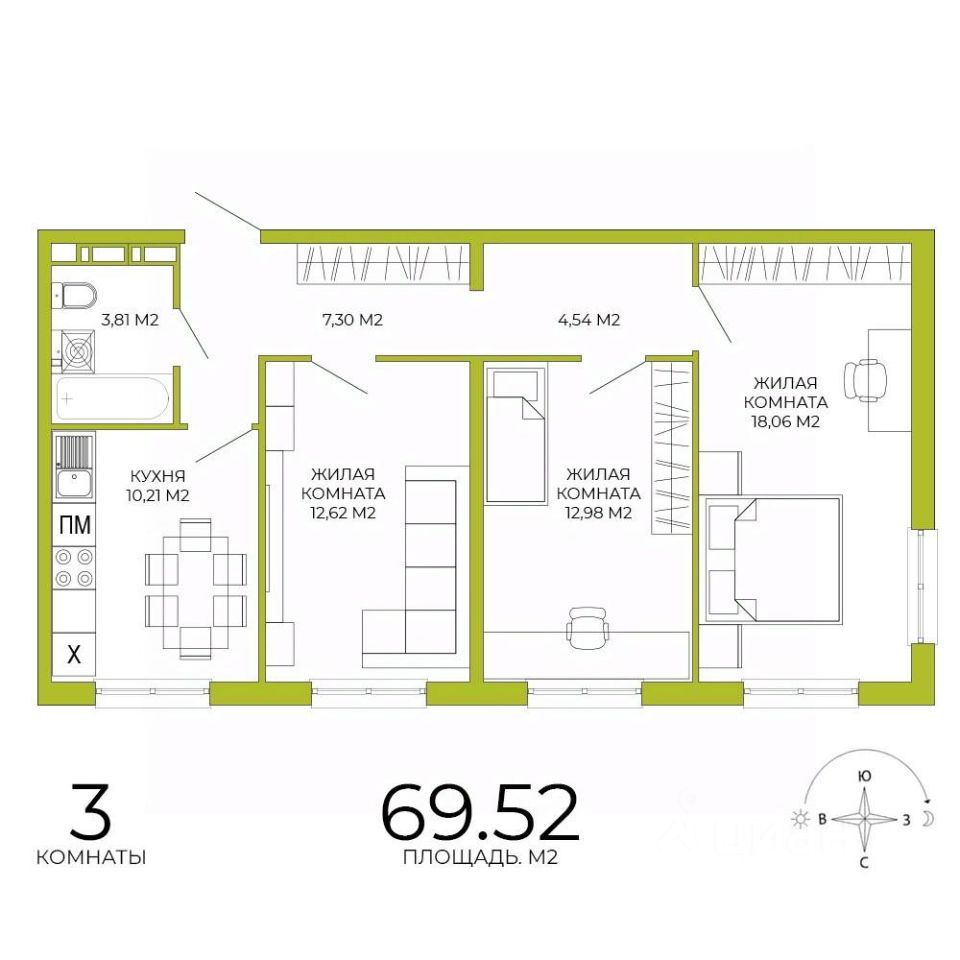 Продаётся 3-комнатная квартира в строящемся доме (дом 3), срок сдачи: IV-кв. 2026, общей площадью 69.52 кв.м., на 3 этаже. Дизайнерская отделка.