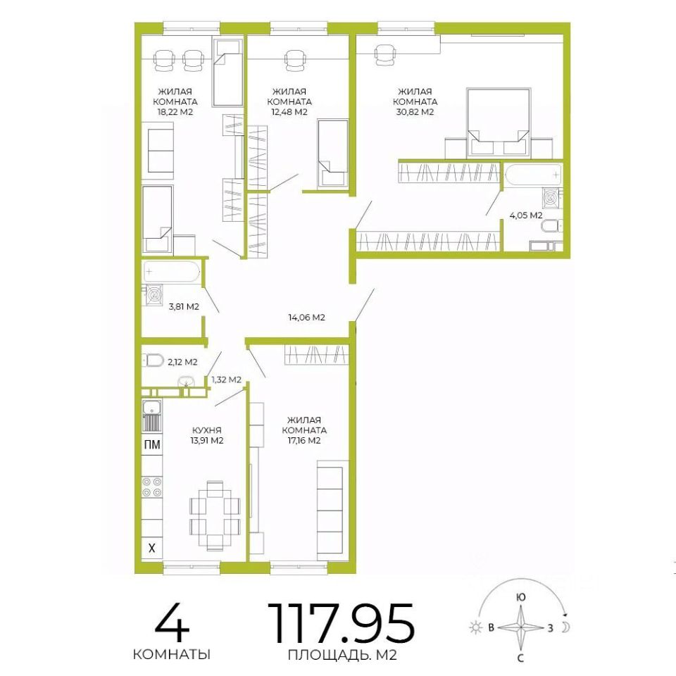 Продаётся 4-комнатная квартира в строящемся доме (дом 3), срок сдачи: IV-кв. 2026, общей площадью 117.95 кв.м., на 8 этаже. Дизайнерская отделка.