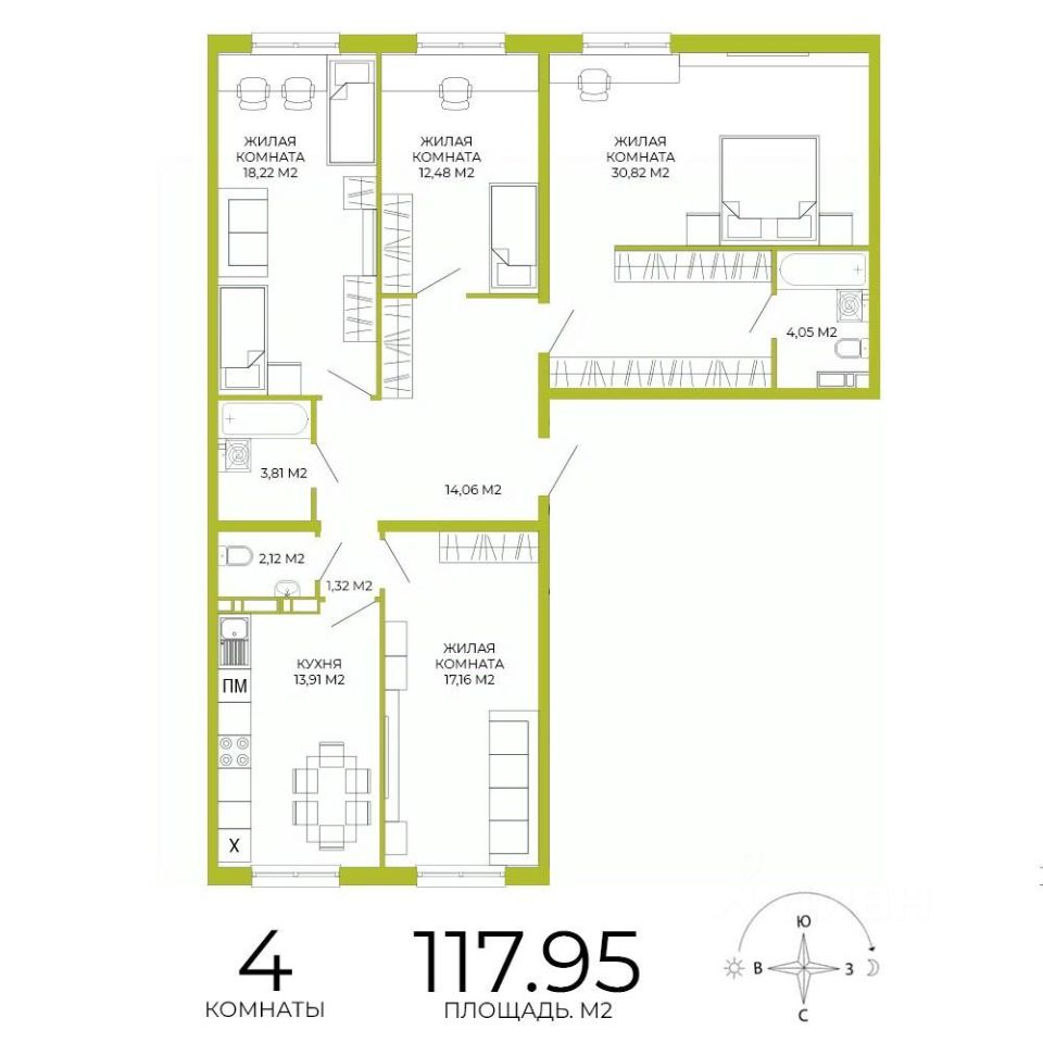 Продаётся 4-комнатная квартира в строящемся доме (дом 3), срок сдачи: IV-кв. 2026, общей площадью 117.95 кв.м., на 12 этаже. Дизайнерская отделка.
