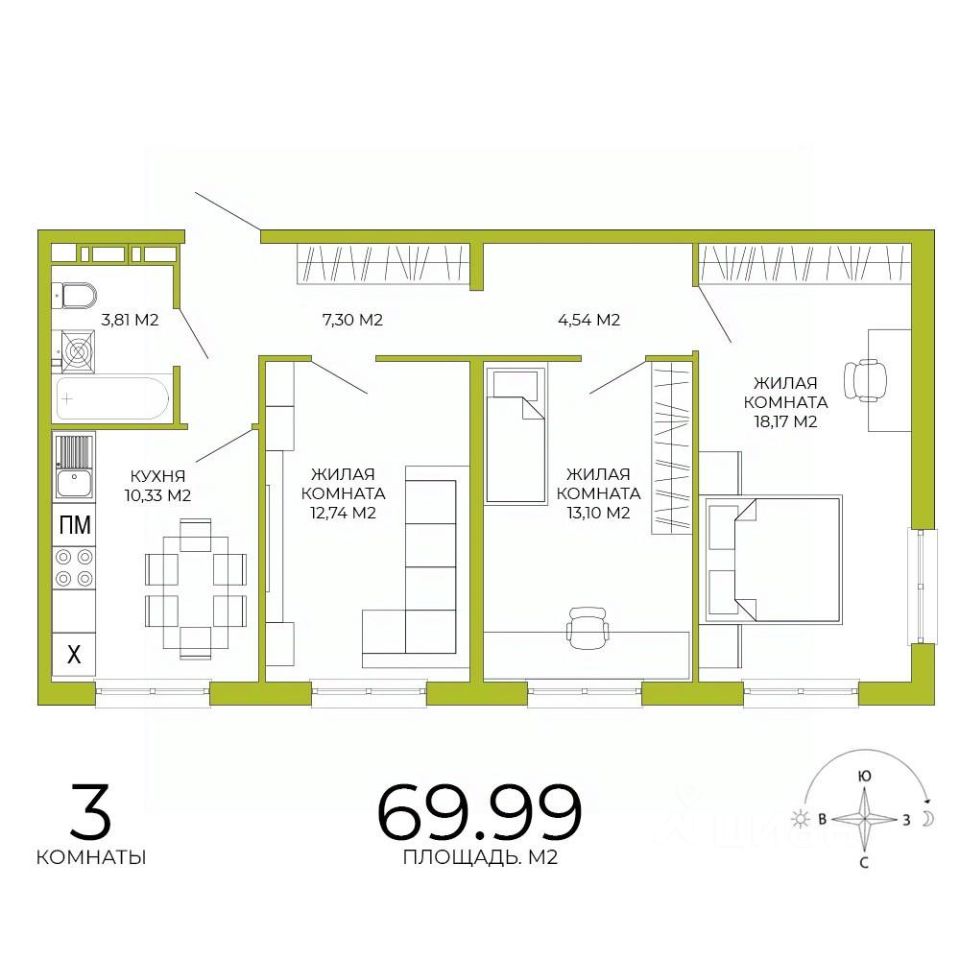 Продаётся 3-комнатная квартира в строящемся доме (дом 3), срок сдачи: IV-кв. 2026, общей площадью 69.99 кв.м., на 14 этаже. Дизайнерская отделка.