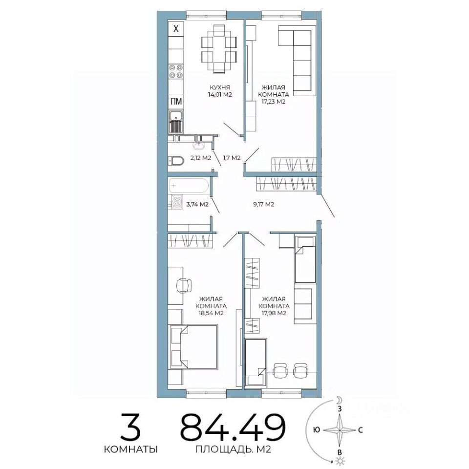 Продаётся 3-комнатная квартира в строящемся доме (дом 6), срок сдачи: IV-кв. 2026, общей площадью 84.49 кв.м., на 3 этаже. Дизайнерская отделка.