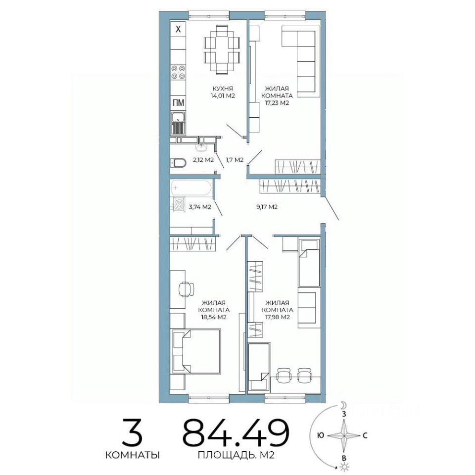 Продаётся 3-комнатная квартира в строящемся доме (дом 6), срок сдачи: IV-кв. 2026, общей площадью 84.49 кв.м., на 4 этаже. Дизайнерская отделка.