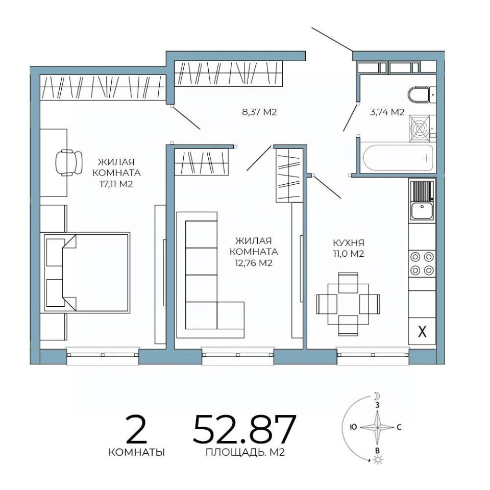 Продаётся 2-комнатная квартира в строящемся доме (дом 6), срок сдачи: IV-кв. 2026, общей площадью 52.87 кв.м., на 5 этаже. Дизайнерская отделка.
