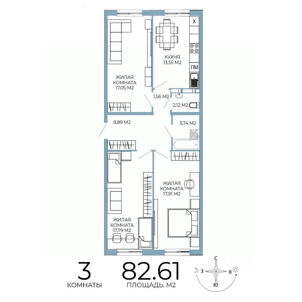 Продаётся 3-комнатная квартира в строящемся доме (дом 6), срок сдачи: IV-кв. 2026, общей площадью 82.61 кв.м., на 3 этаже. Дизайнерская отделка.