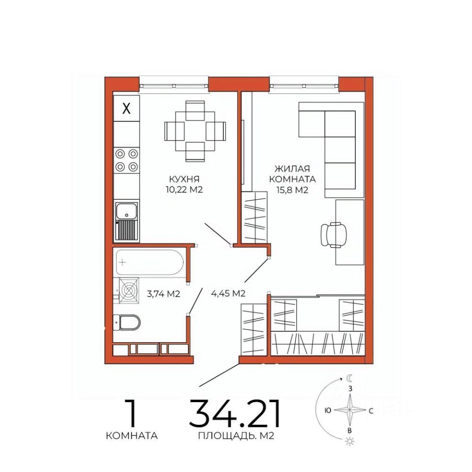 Продаётся 1-комнатная квартира в сданном доме (дом 8), срок сдачи: III-кв. 2025, общей площадью 34.21 кв.м., на 18 этаже. Дизайнерская отделка.