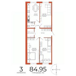 Продаётся 3-комнатная квартира в сданном доме (дом 8), срок сдачи: III-кв. 2025, общей площадью 84.94 кв.м., на 6 этаже. Дизайнерская отделка.