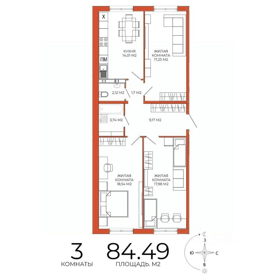 Продаётся 3-комнатная квартира в сданном доме (дом 8), срок сдачи: III-кв. 2025, общей площадью 84.49 кв.м., на 3 этаже. Дизайнерская отделка.