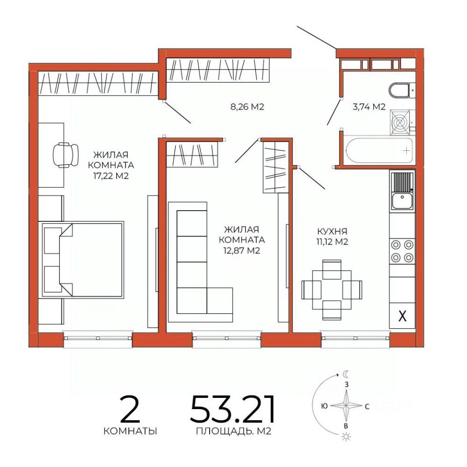 Продаётся 2-комнатная квартира в сданном доме (дом 8), срок сдачи: III-кв. 2025, общей площадью 53.21 кв.м., на 9 этаже. Дизайнерская отделка.
