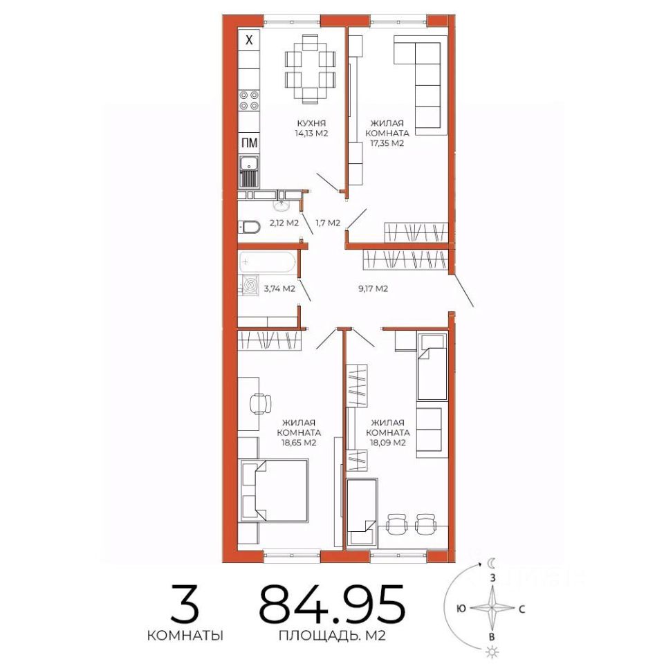Продаётся 3-комнатная квартира в сданном доме (дом 8), срок сдачи: III-кв. 2025, общей площадью 84.95 кв.м., на 10 этаже. Дизайнерская отделка.