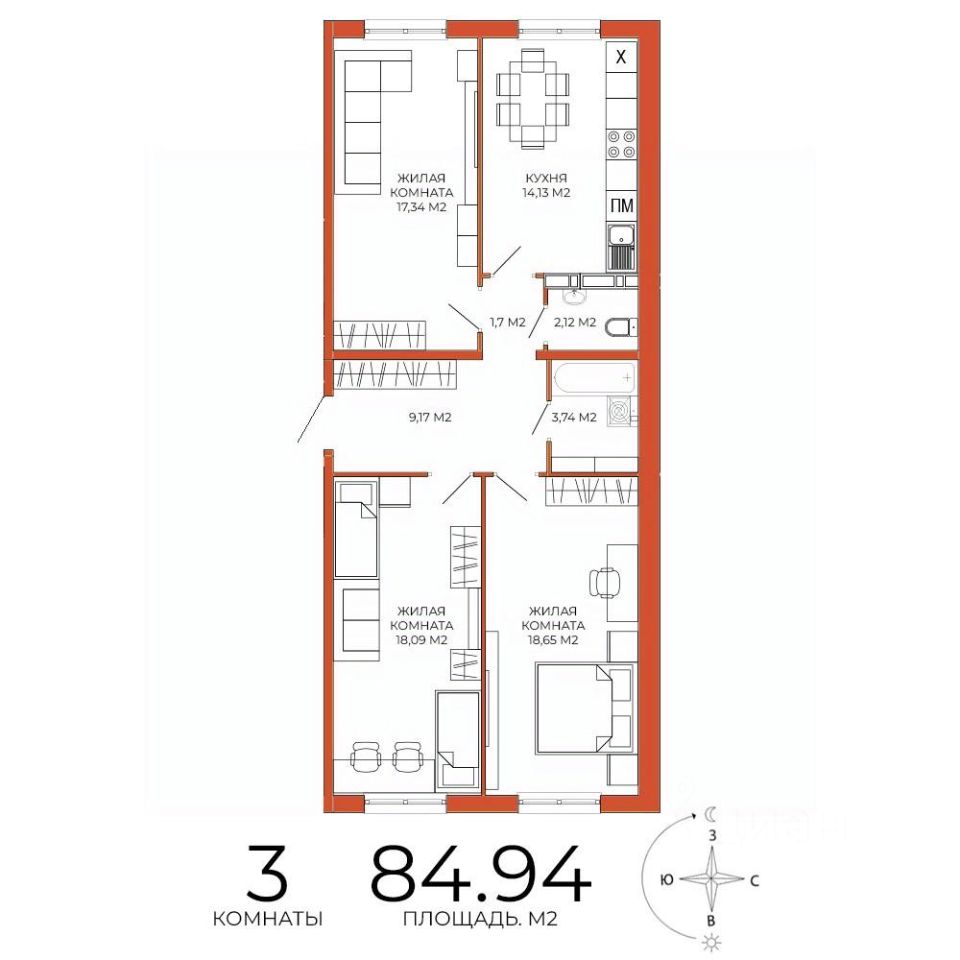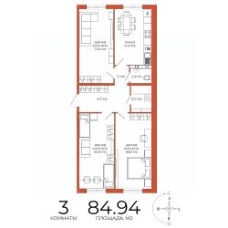 Продаётся 3-комнатная квартира в сданном доме (дом 8), срок сдачи: III-кв. 2025, общей площадью 84.94 кв.м., на 14 этаже. Дизайнерская отделка.