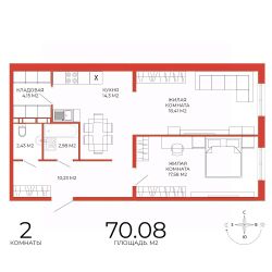Продаётся 2-комнатная квартира в сданном доме (дом 8), срок сдачи: III-кв. 2025, общей площадью 70.08 кв.м., на 2 этаже. Дизайнерская отделка.