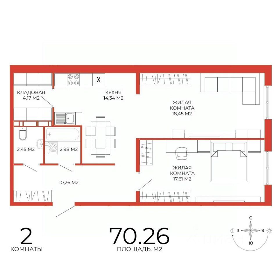 Продаётся 2-комнатная квартира в сданном доме (дом 8), срок сдачи: III-кв. 2025, общей площадью 70.26 кв.м., на 12 этаже. Дизайнерская отделка.