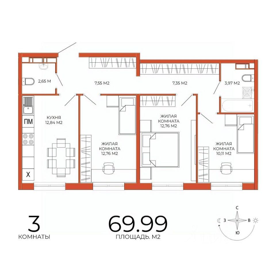 Продаётся 3-комнатная квартира в сданном доме (дом 8), срок сдачи: III-кв. 2025, общей площадью 69.99 кв.м., на 4 этаже. Дизайнерская отделка.