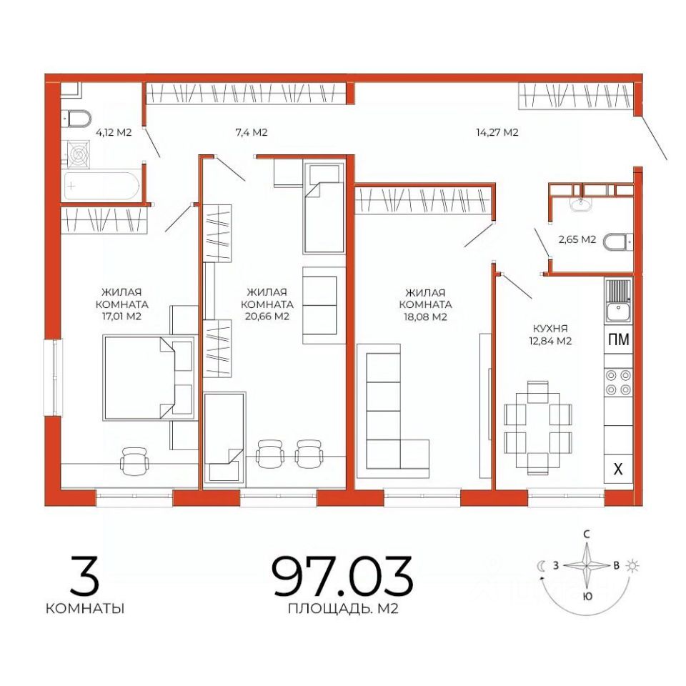 Продаётся 3-комнатная квартира в сданном доме (дом 8), срок сдачи: III-кв. 2025, общей площадью 97.03 кв.м., на 4 этаже. Дизайнерская отделка.