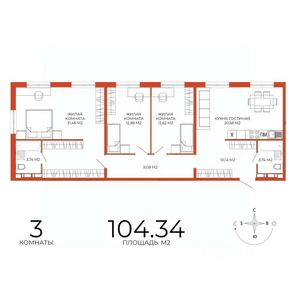 Продаётся 3-комнатная квартира в сданном доме (дом 8), срок сдачи: III-кв. 2025, общей площадью 104.34 кв.м., на 4 этаже. Дизайнерская отделка.