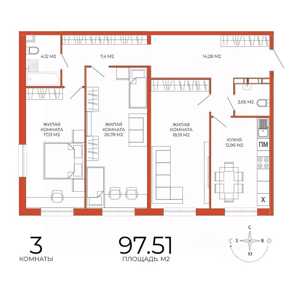 Продаётся 3-комнатная квартира в сданном доме (дом 8), срок сдачи: III-кв. 2025, общей площадью 97.51 кв.м., на 6 этаже. Дизайнерская отделка.
