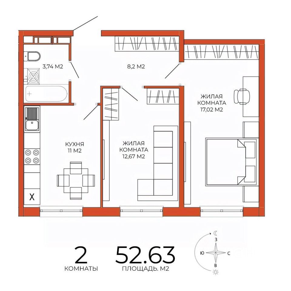 Продаётся 2-комнатная квартира в сданном доме (дом 8), срок сдачи: III-кв. 2025, общей площадью 52.63 кв.м., на 2 этаже. Дизайнерская отделка.