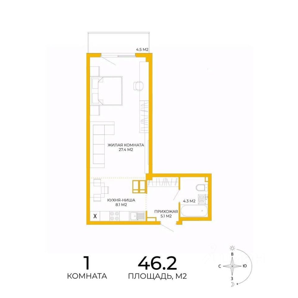 Продаётся 1-комнатная квартира в сданном доме (дом 14), срок сдачи: IV-кв. 2024, общей площадью 46.2 кв.м., на 17 этаже. Дизайнерская отделка.