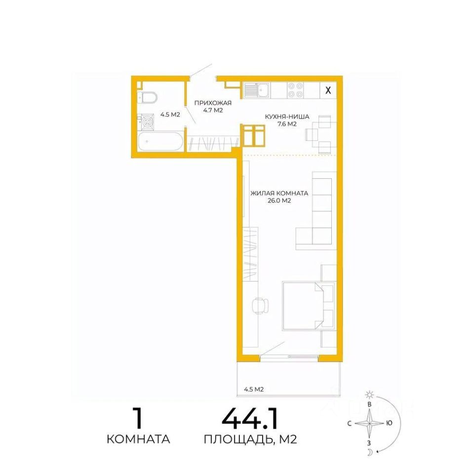 Продаётся 1-комнатная квартира в сданном доме (дом 14), срок сдачи: IV-кв. 2024, общей площадью 44.1 кв.м., на 17 этаже. Дизайнерская отделка.