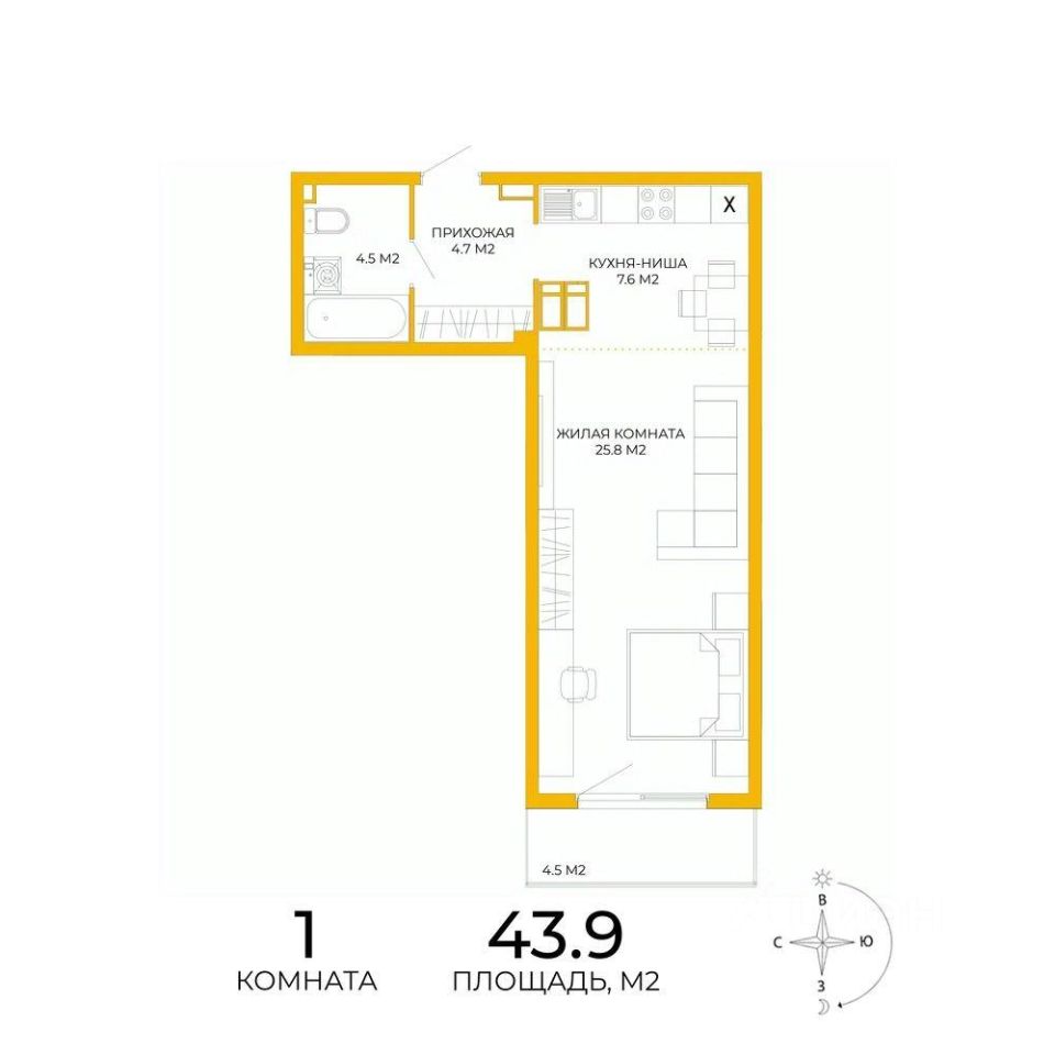 Продаётся 1-комнатная квартира в сданном доме (дом 14), срок сдачи: IV-кв. 2024, общей площадью 43.9 кв.м., на 6 этаже. Дизайнерская отделка.