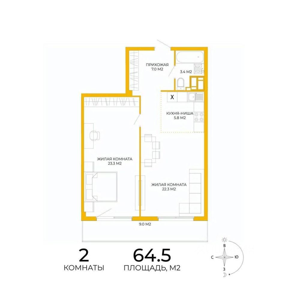 Продаётся 2-комнатная квартира в сданном доме (дом 14), срок сдачи: IV-кв. 2024, общей площадью 64.5 кв.м., на 7 этаже. Дизайнерская отделка.
