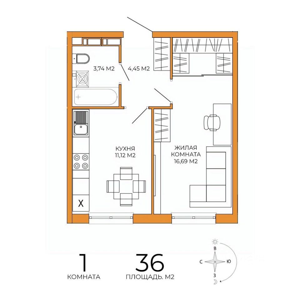 Продаётся 1-комнатная квартира в сданном доме (дом 9), срок сдачи: IV-кв. 2024, общей площадью 36 кв.м., на 12 этаже. Дизайнерская отделка.