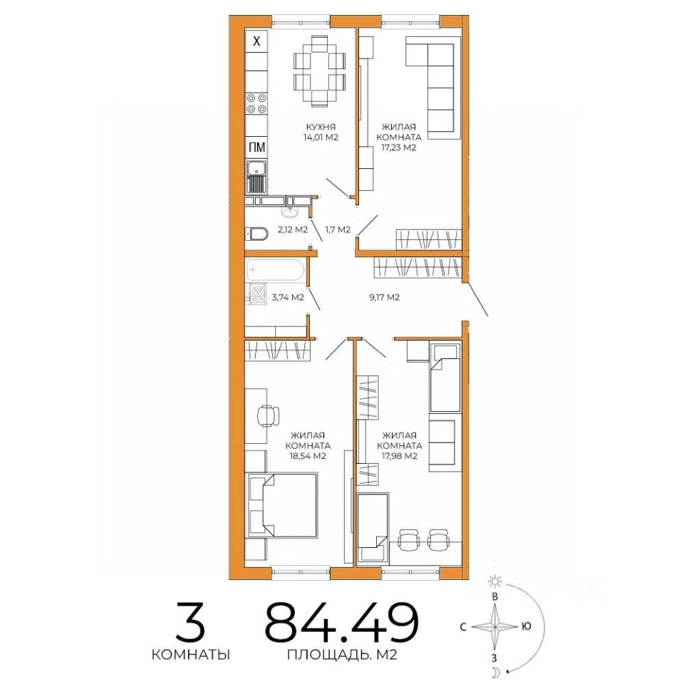 Продаётся 3-комнатная квартира в сданном доме (дом 9), срок сдачи: IV-кв. 2024, общей площадью 84.49 кв.м., на 5 этаже. Дизайнерская отделка.