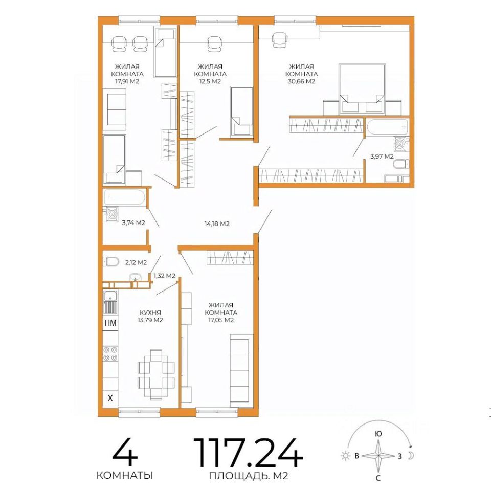 Продаётся 4-комнатная квартира в сданном доме (дом 9), срок сдачи: IV-кв. 2024, общей площадью 117.24 кв.м., на 3 этаже. Дизайнерская отделка.
