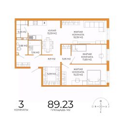 Продаётся 3-комнатная квартира в сданном доме (дом 9), срок сдачи: IV-кв. 2024, общей площадью 89.23 кв.м., на 11 этаже. Дизайнерская отделка.