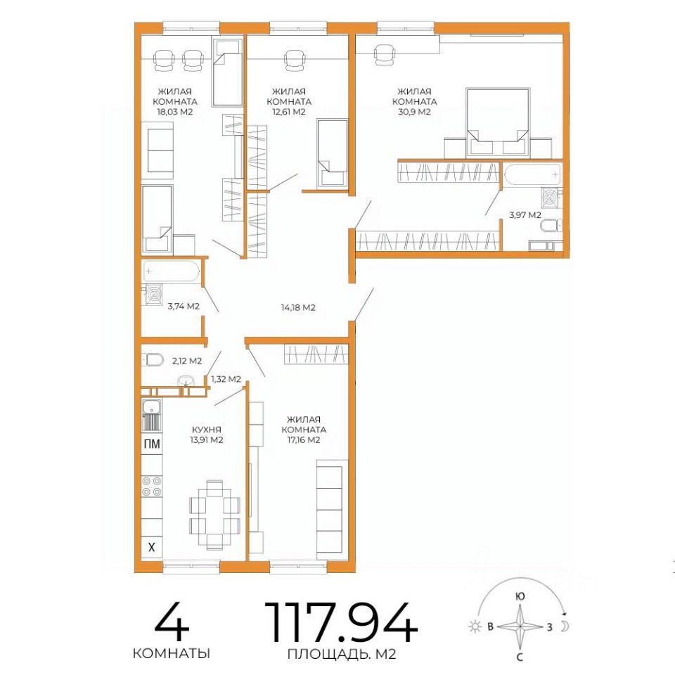 Продаётся 4-комнатная квартира в сданном доме (дом 9), срок сдачи: IV-кв. 2024, общей площадью 117.94 кв.м., на 14 этаже. Дизайнерская отделка.