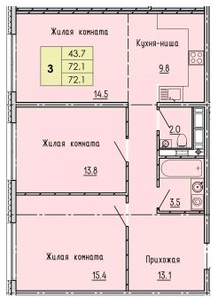 Продаётся 3-комнатная квартира в сданном доме (дом 19), срок сдачи: III-кв. 2023, общей площадью 72.1 кв.м., на 14 этаже. Дизайнерская отделка.