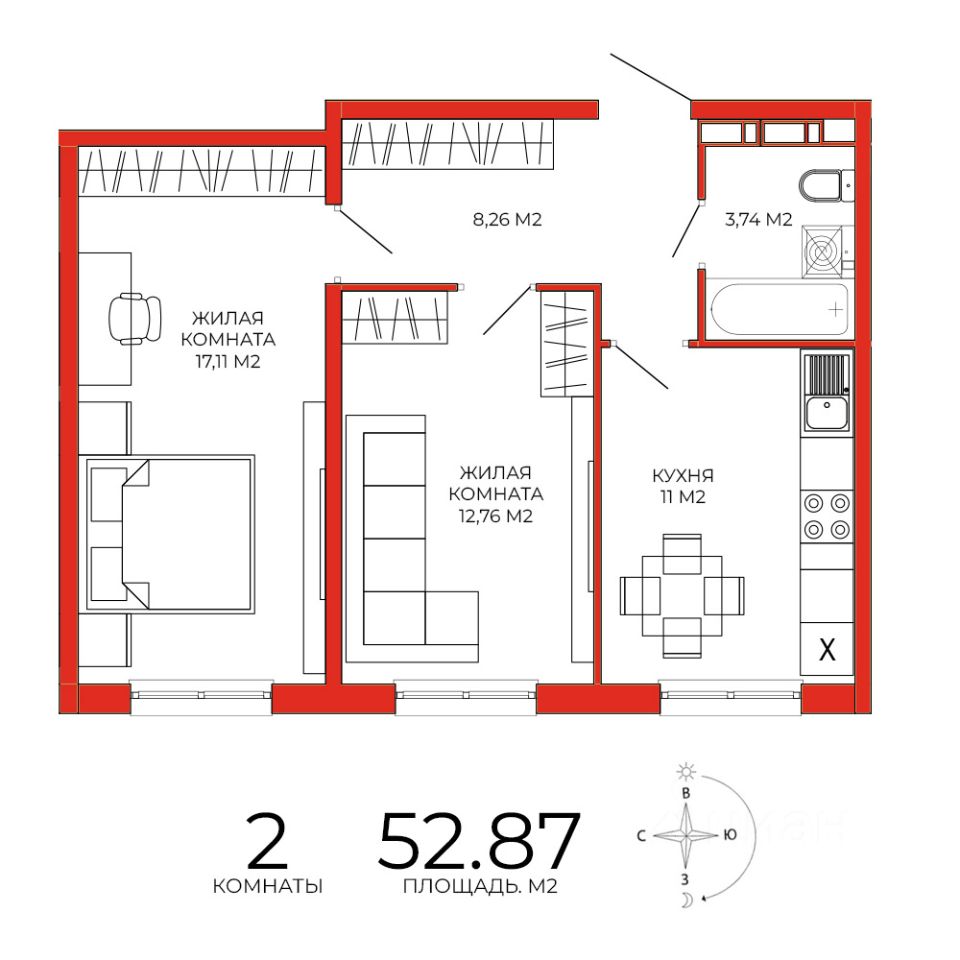 Продаётся 2-комнатная квартира в строящемся доме (дом 7), срок сдачи: III-кв. 2025, общей площадью 52.87 кв.м., на 3 этаже. Дизайнерская отделка.