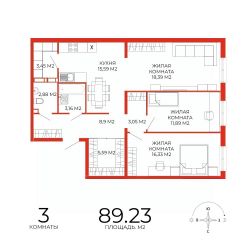 Продаётся 3-комнатная квартира в строящемся доме (дом 7), срок сдачи: III-кв. 2025, общей площадью 89.23 кв.м., на 3 этаже. Дизайнерская отделка.