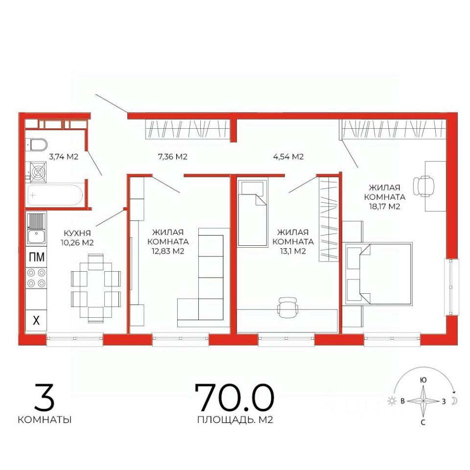 Продаётся 3-комнатная квартира в строящемся доме (дом 7), срок сдачи: III-кв. 2025, общей площадью 70 кв.м., на 14 этаже. Дизайнерская отделка.