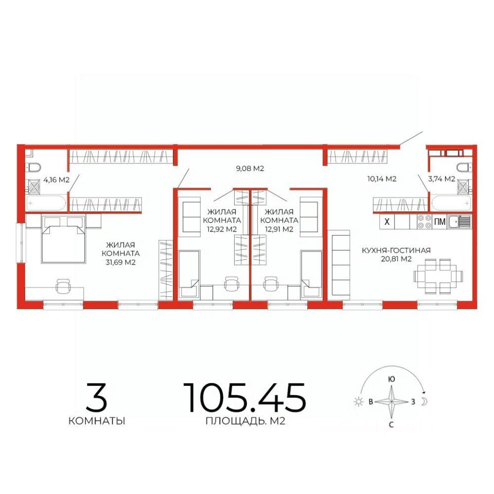 Продаётся 3-комнатная квартира в строящемся доме (дом 7), срок сдачи: III-кв. 2025, общей площадью 105.45 кв.м., на 10 этаже. Дизайнерская отделка.
