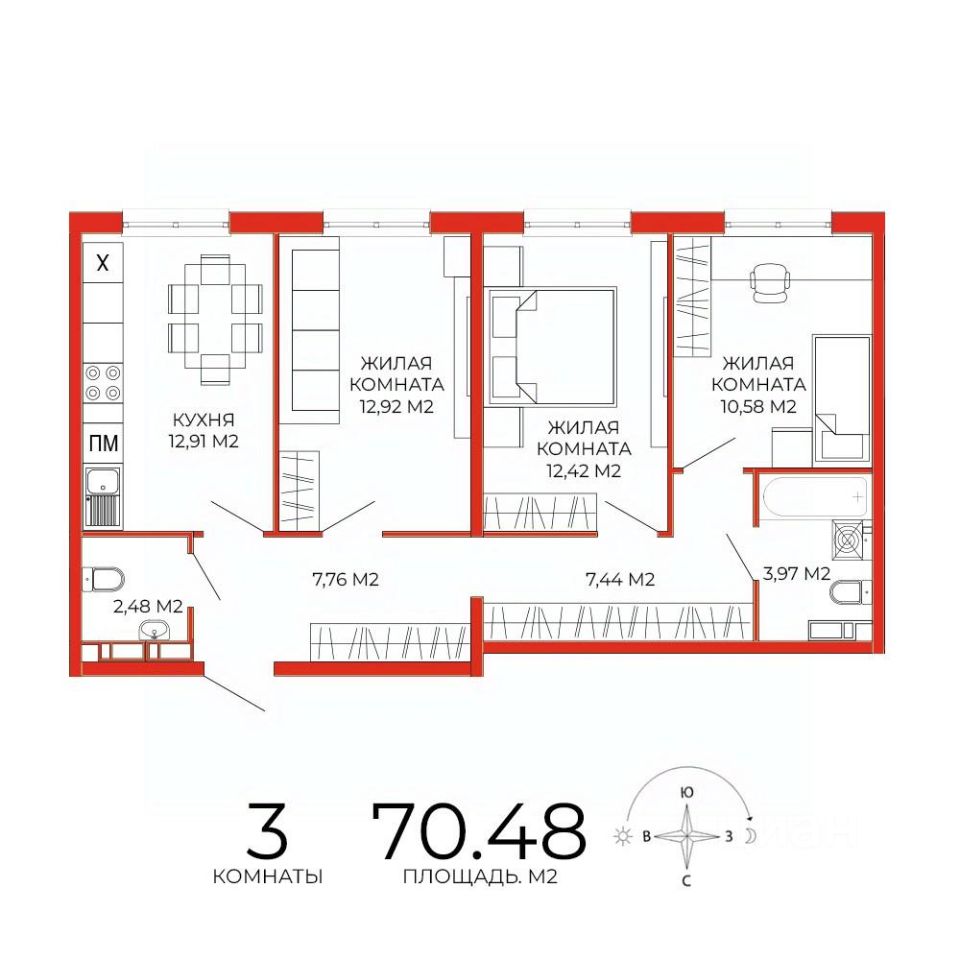 Продаётся 3-комнатная квартира в строящемся доме (дом 7), срок сдачи: III-кв. 2025, общей площадью 70.48 кв.м., на 13 этаже. Дизайнерская отделка.