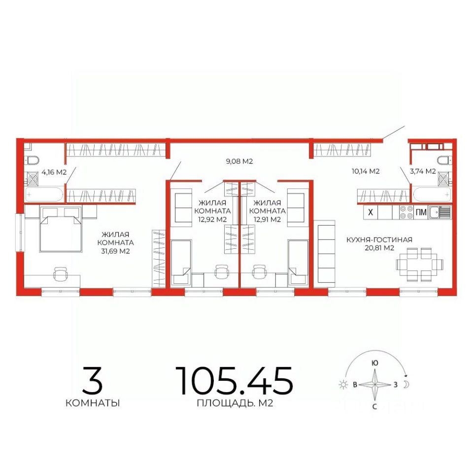 Продаётся 3-комнатная квартира в строящемся доме (дом 7), срок сдачи: III-кв. 2025, общей площадью 105.45 кв.м., на 13 этаже. Дизайнерская отделка.