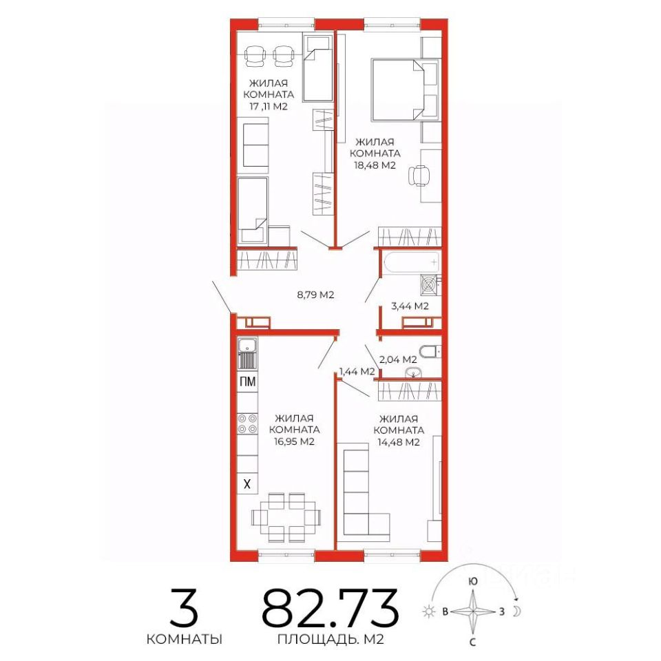 Продаётся 3-комнатная квартира в строящемся доме (дом 7), срок сдачи: III-кв. 2025, общей площадью 82.73 кв.м., на 14 этаже. Дизайнерская отделка.