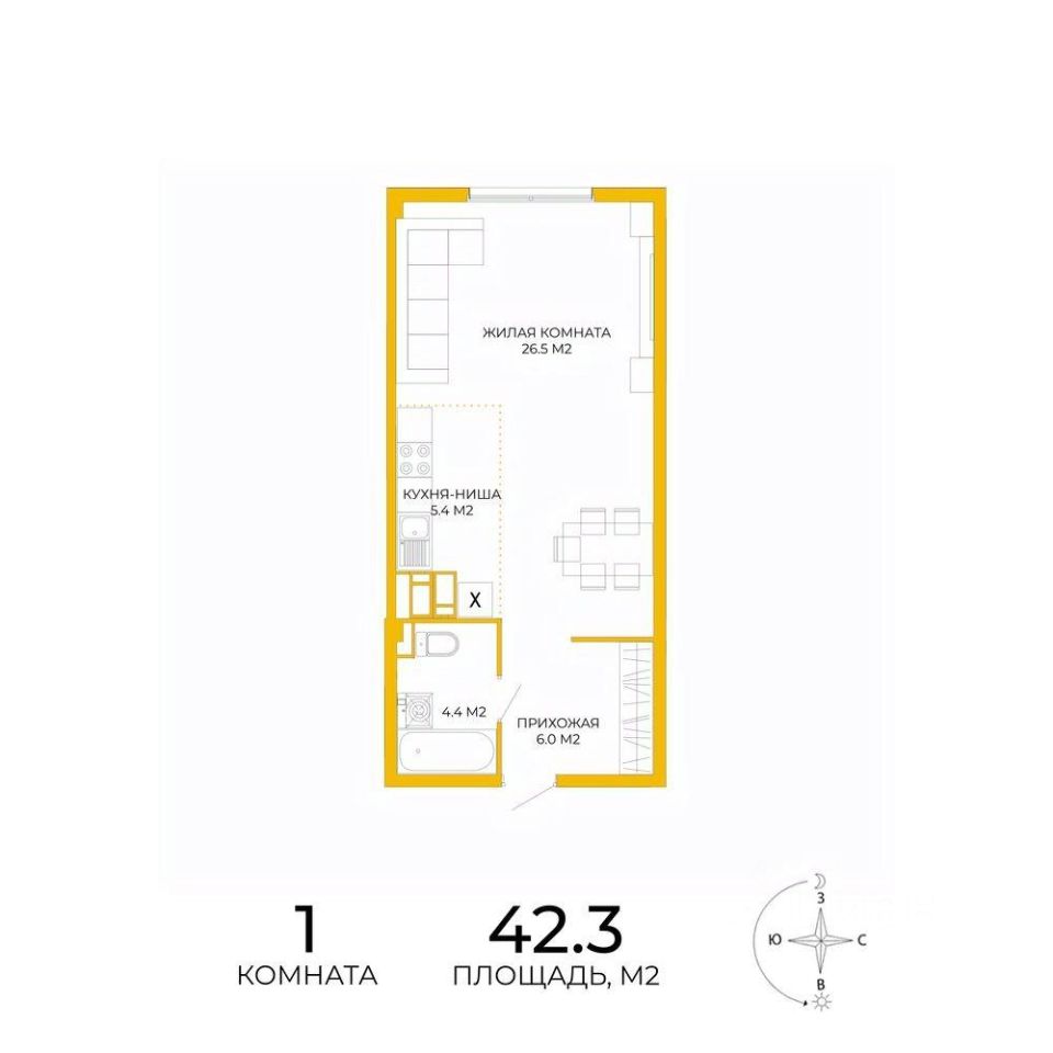 Продаётся 1-комнатная квартира в сданном доме (дом 13), срок сдачи: IV-кв. 2024, общей площадью 42.3 кв.м., на 4 этаже. Дизайнерская отделка.