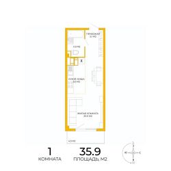 Продаётся 1-комнатная квартира в сданном доме (дом 13), срок сдачи: IV-кв. 2024, общей площадью 35.9 кв.м., на 9 этаже. Дизайнерская отделка.