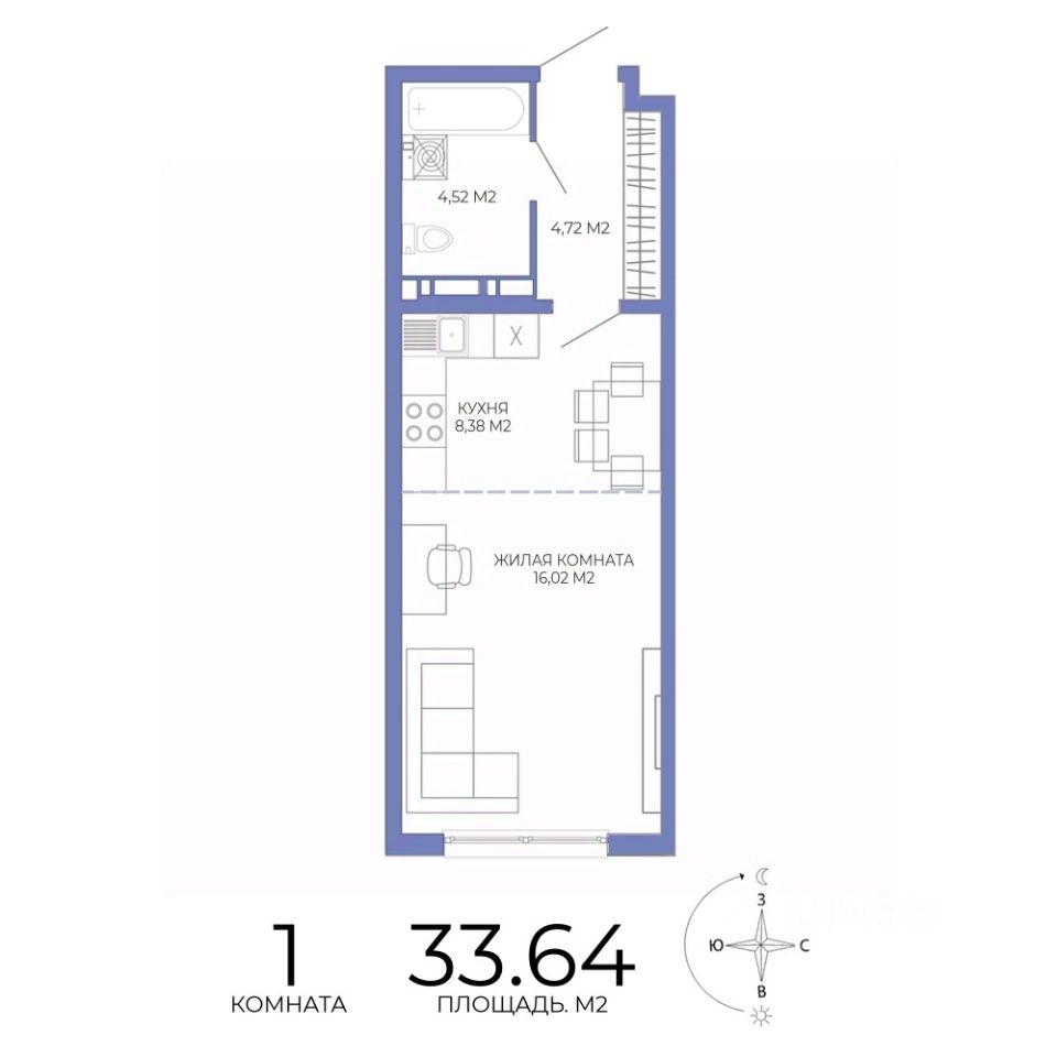 Продаётся 1-комнатная квартира в строящемся доме (дом 1), срок сдачи: II-кв. 2027, общей площадью 33.64 кв.м., на 7 этаже. Дизайнерская отделка.