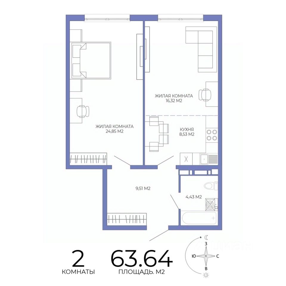 Продаётся 2-комнатная квартира в строящемся доме (дом 1), срок сдачи: II-кв. 2027, общей площадью 63.64 кв.м., на 9 этаже. Дизайнерская отделка.