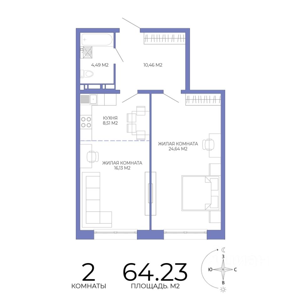Продаётся 2-комнатная квартира в строящемся доме (дом 1), срок сдачи: II-кв. 2027, общей площадью 64.23 кв.м., на 2 этаже. Дизайнерская отделка.